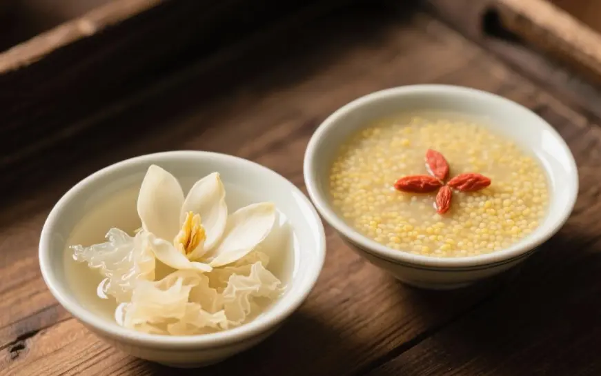 百合银耳汤:鲜百合30克、银耳半朵、枸杞少许,煮至软烂